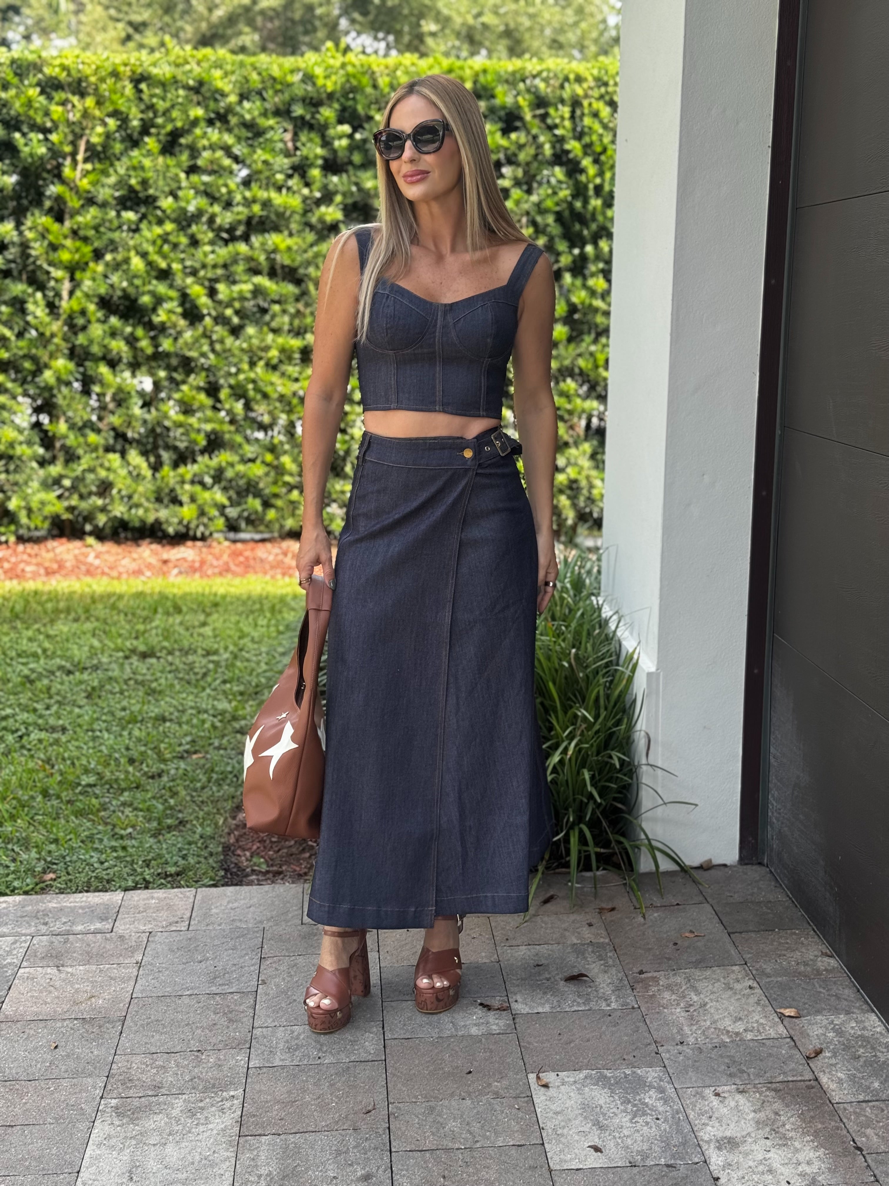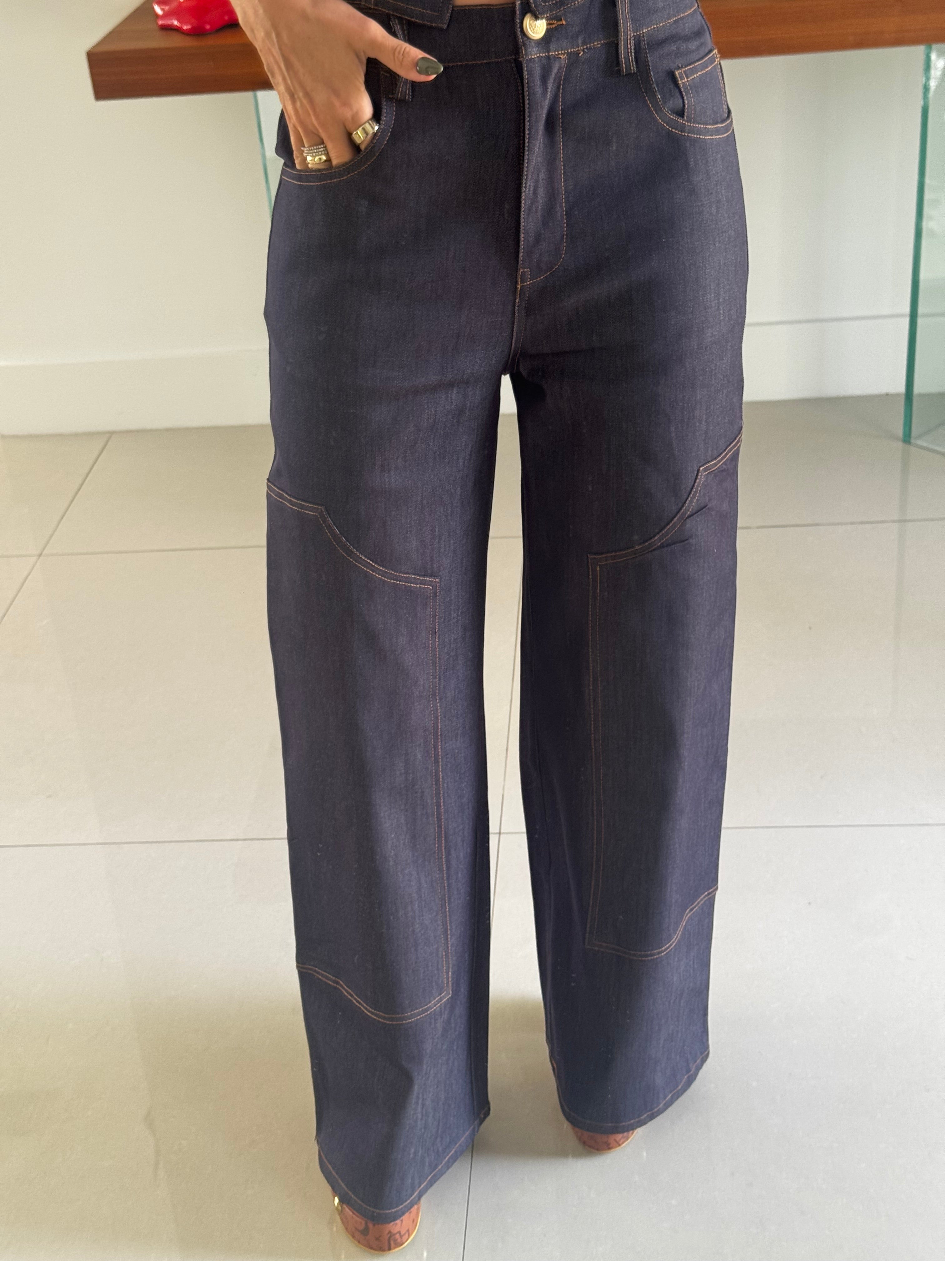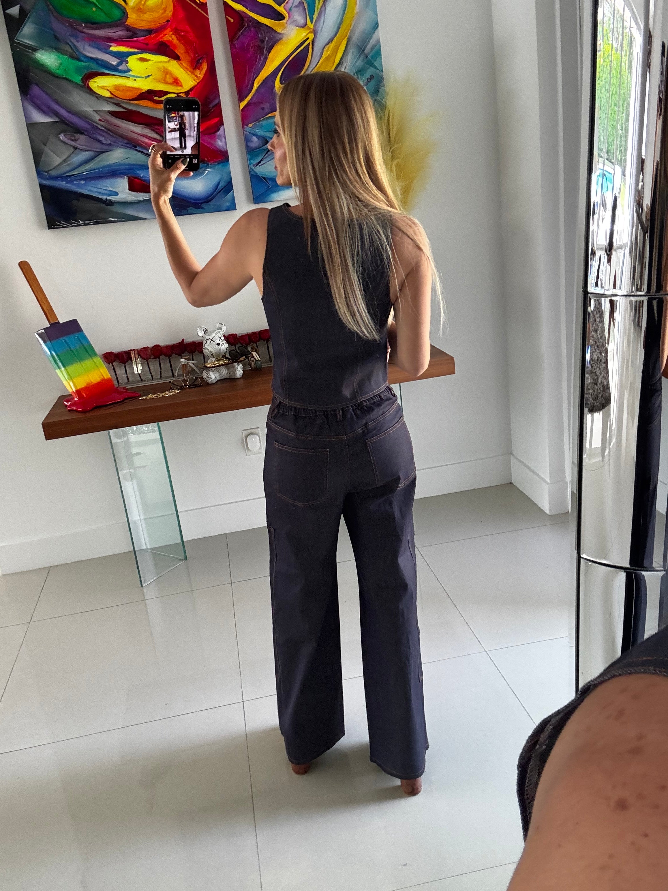 Indigo denim gold button top and pants set.